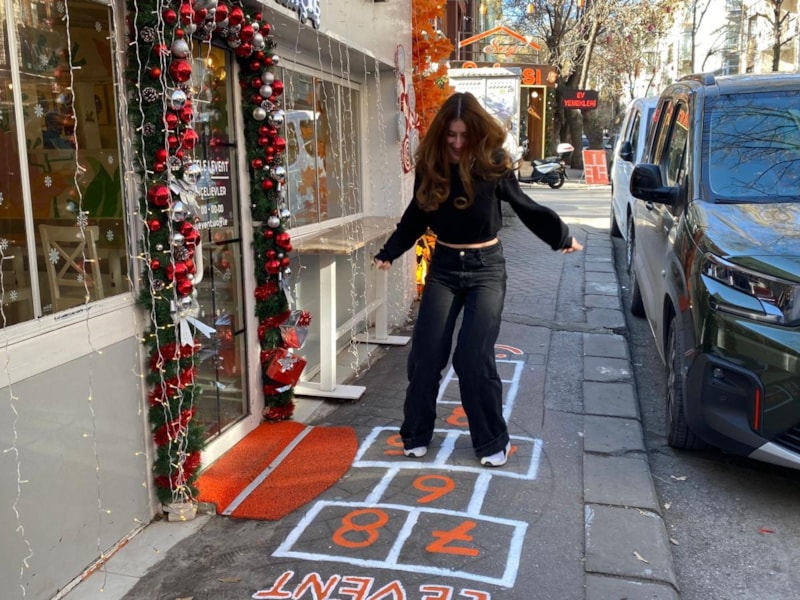 Ankara'nın Çankaya ilçesi Yukarı Bahçelievler Mahallesi’nde 17 yıldır esnaflık yapan Levent Çelik, 6 yaşındaki kızının oynaması için tatlı dükkanının önünde bulunan kaldırıma seksek oyunu çizdi.