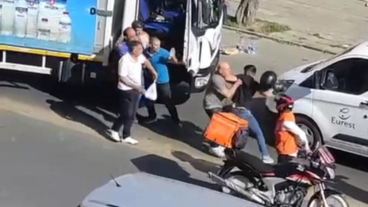 Moto kurye ile kamyonet sürücüsü arasında yaşanan kasklı, tekme ve yumruklu kavga anları çevredeki vatandaşların telefon kameraları ile kaydedildi.
