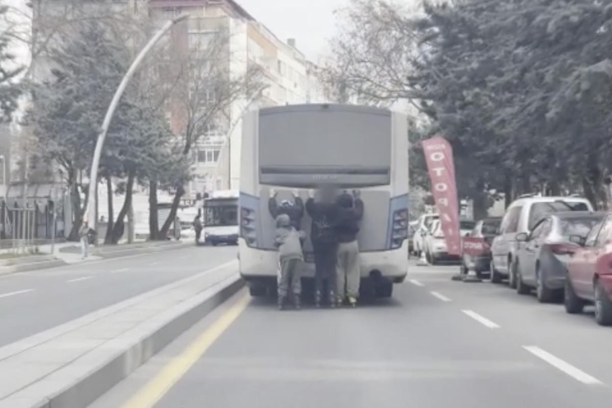 Ankara'nın Çankaya ilçesi Eti Mahallesi'nde patenli 4 çocuk, seyir halindeki bir otobüsün arka kısmına tutundu.