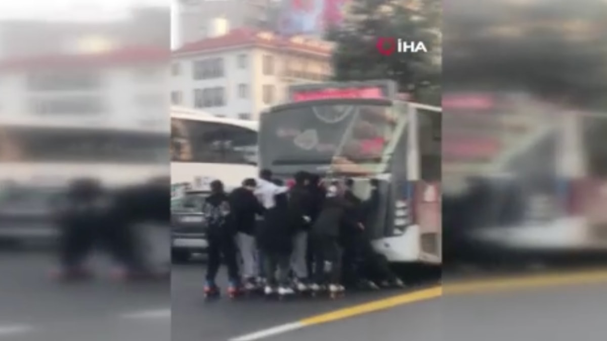 Olayda, patenli bir grup genç, seyir halindeki bir halk otobüsünün arkasına tutunarak ilerledi.
