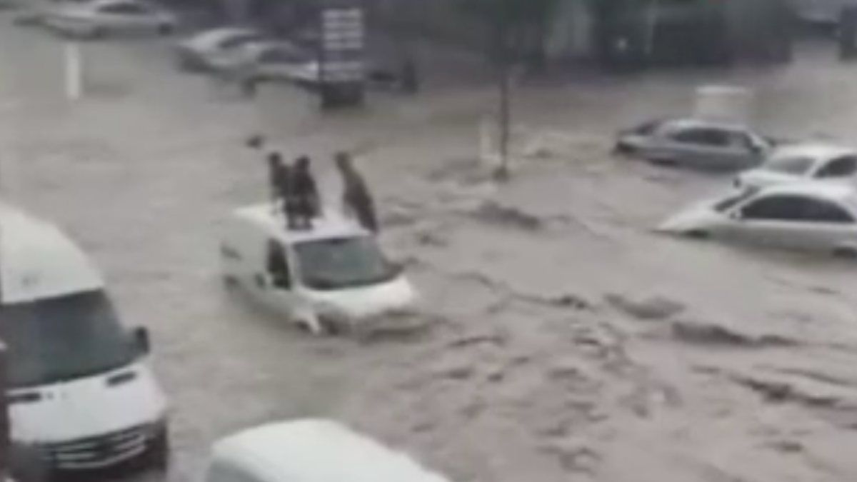 Dereye dönüşen caddelerde araçları ile suyun ortasında kalan bazı vatandaşlar, canlarını araçların üstüne çıkarak kurtardı.