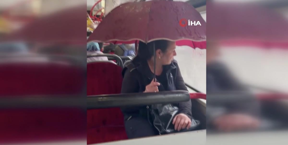 Tavandan yağmur suları akmaya devam ederken, otobüste bulunan bir kadın yolcunun araçta şemsiye atarak oturması dikkatlerden kaçmadı.
