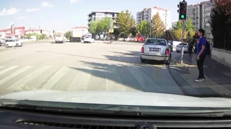 Başka bir otomobilin araç içi kamerasına yansıyan görüntülerde kazanın meydana geldiği anda yaya geçidinde bekleyen öğrencinin süratli bir şekilde üzerine gelen otomobili fark ettiği, otomobilden son anda kaçarak şans eseri yara almadan kurtulduğu görüldü.