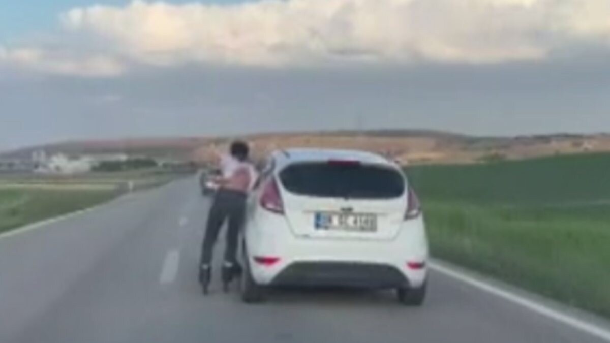 Arkadan gelen bir araçtaki vatandaşlar, patenli genci cep telefonu kamerasıyla kayıt altına aldı.
