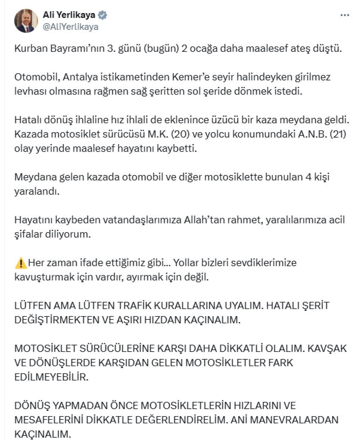 Bakan Yerlikaya paylaşımında, "Kurban Bayramı’nın 3. günü (bugün) 2 ocağa daha maalesef ateş düştü. Otomobil, Antalya istikametinden Kemer’e seyir halindeyken girilmez levhası olmasına rağmen sağ şeritten sol şeride dönmek istedi. Hatalı dönüş ihlaline hız ihlali de eklenince üzücü bir kaza meydana geldi. Kazada motosiklet sürücüsü M.K. (20) ve yolcu konumundaki A.N.B. (21) olay yerinde maalesef hayatını kaybetti. Meydana gelen kazada otomobil ve diğer motosiklette bunulan 4 kişi yaralandı. Hayatını kaybeden vatandaşlarımıza Allah’tan rahmet, yaralılarımıza acil şifalar diliyorum. Her zaman ifade ettiğimiz gibi. Yollar bizleri sevdiklerimize kavuşturmak için vardır, ayırmak için değil" ifadelerine yer verdi.