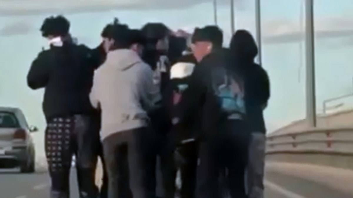 Hem kendi canları hem diğer sürücülerin canını teklikeye atan grup, yokuş yukarı üst geçitten geçebilmek için seyir halindeki otomobile tutundu.