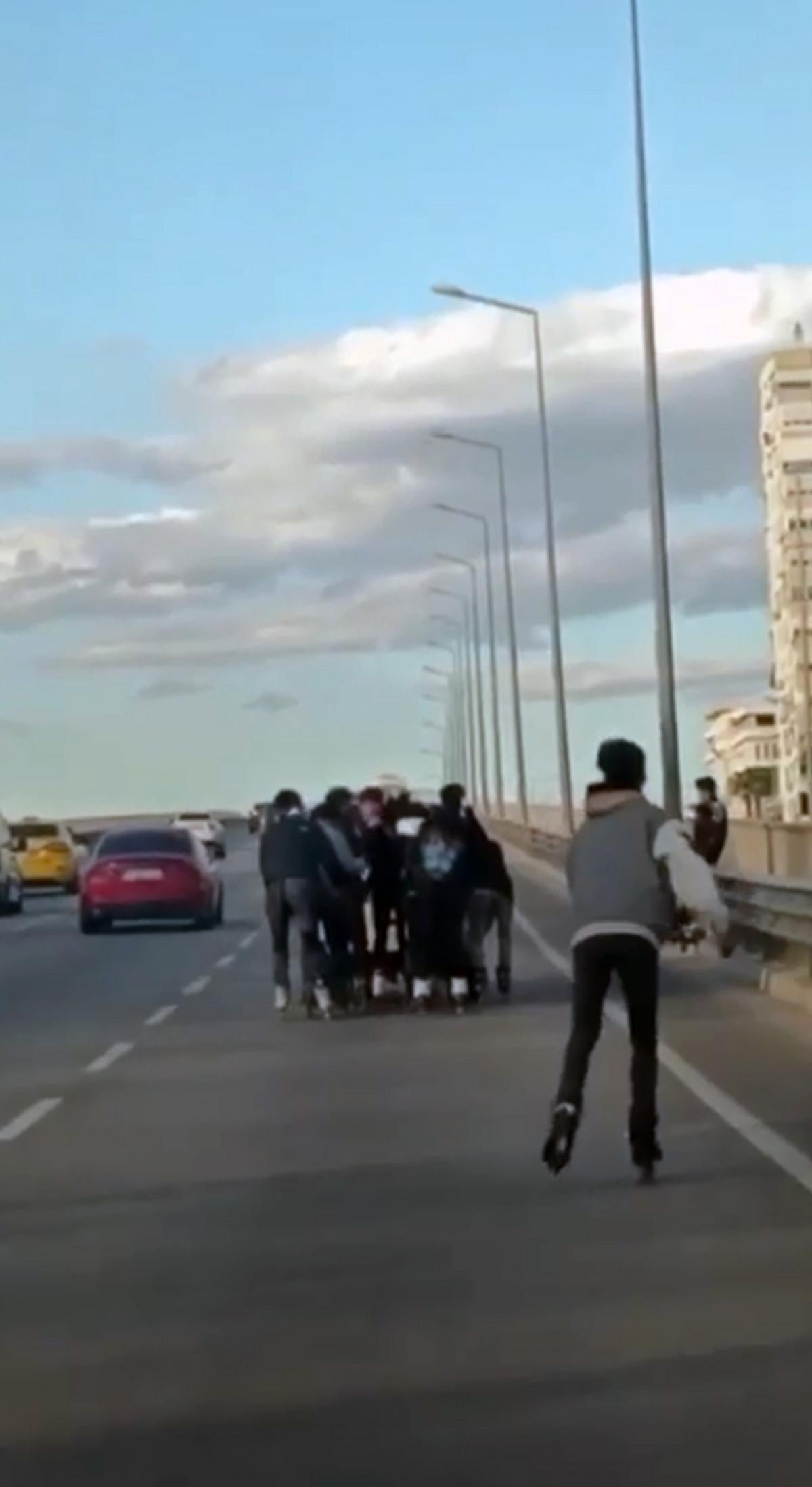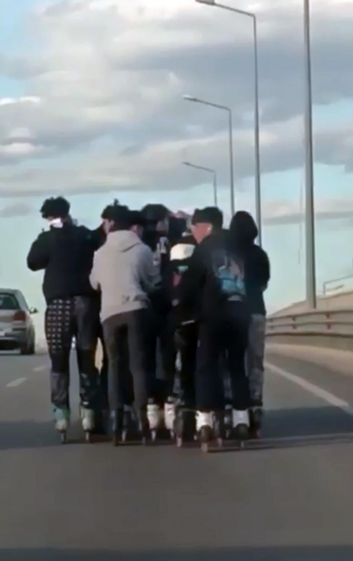 Yaşanan tehlikeli yolculuk ve köprü korkuluklarına tutunan başka bir patenli genç de kameralarca saniye saniye görüntülendi.