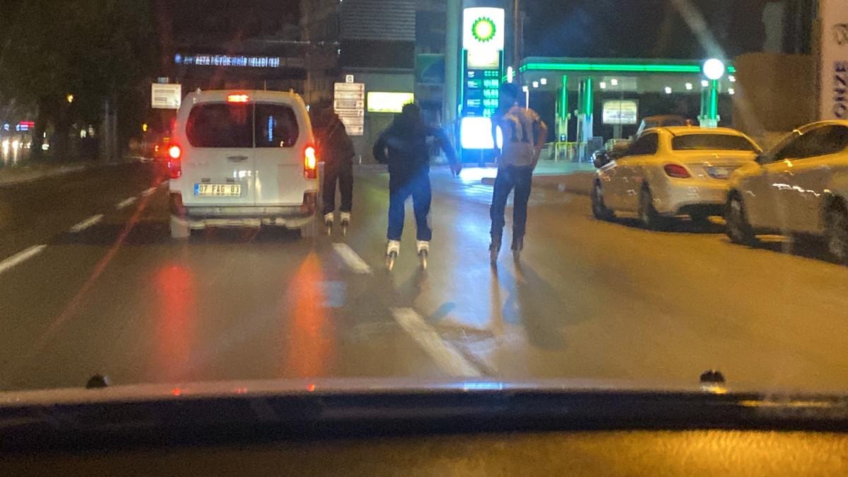 Muratpaşa ilçesinde, patenli 3 genç kırmızı ışıkta bekleyen bir hafif ticari aracın arkasına ve yanlarına tutunarak tehlikeli bir yolculuğa çıktı.