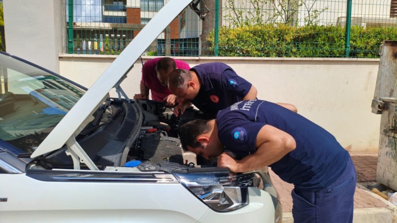 Antalya'da bir aracın motor kısmına giren yavru kedileri vatandaşlar telefondan kedi sesi açarak çıkartmaya çalıştı.