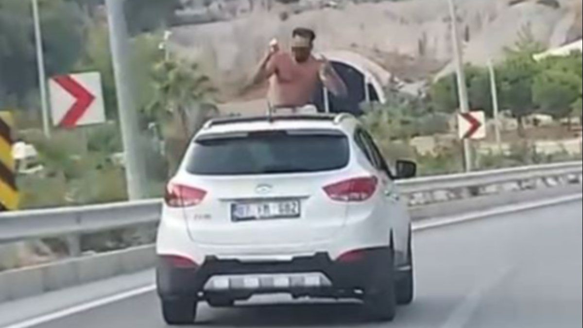 Antalya- Kemer kara yolu üzerinde, 30 Ağustos günü seyir halinde olan bir cipin açılır tavanından çıkan şahıs, aracın üzerine oturarak yolculuk yaptı.