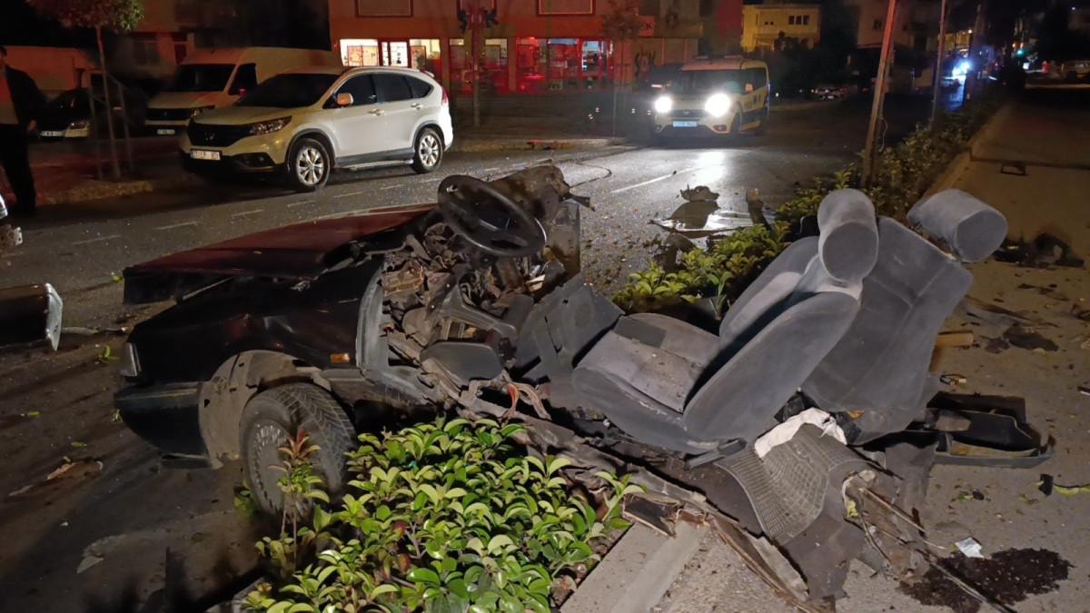 Kontrolden çıkan otomobil, kaldırımda bulunan aydınlatma direğine çarparak ikiye bölündü.