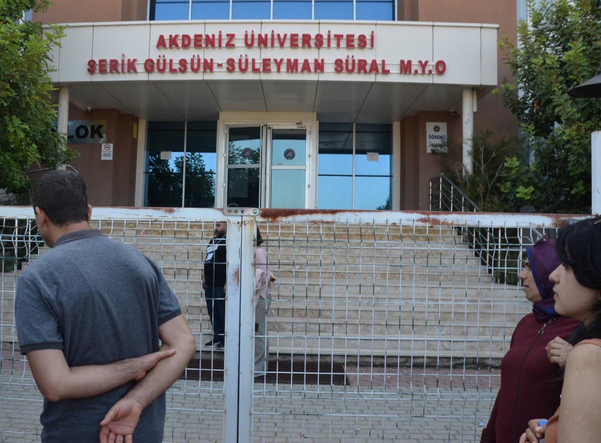 Akdeniz Üniversitesi Serik Gülsün-Süleyman Süral Meslek Yüksekokulu'nda sınava girecek bir aday, 2 dakika gecikmesi üzerine salona alınmadı.