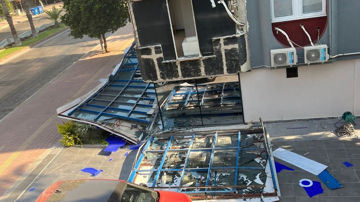 - Antalya'da sabah saatlerinde bir laboratuvarın dış cephe kaplaması yerinden koparak düştü.