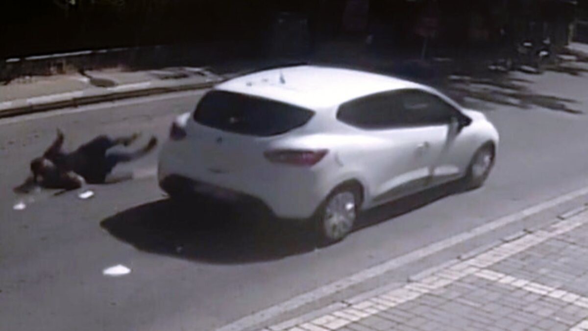 Güvenlik kamerasına, otomobilin yoldan geçtikten sonra bir anda durup geri gelmesi, yolun karşısına geçmeye çalışan kadına çarpması ve kadının elindeki tabakla birlikte savrulduğu anlar yansıdı.