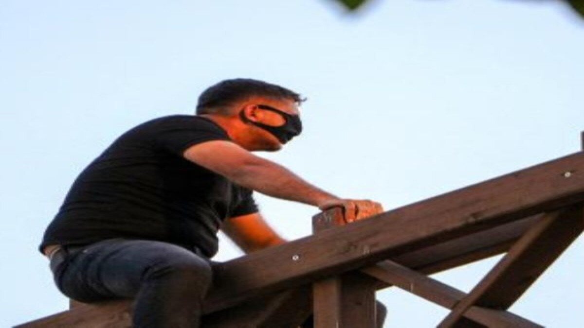 Üst geçidin korkuluklarına tutunan H.E., zaman zaman aşağı sarktı. Bu sırada H.E., ağzında bulunan maskeyi yüzünü kapatmak için kullandı.