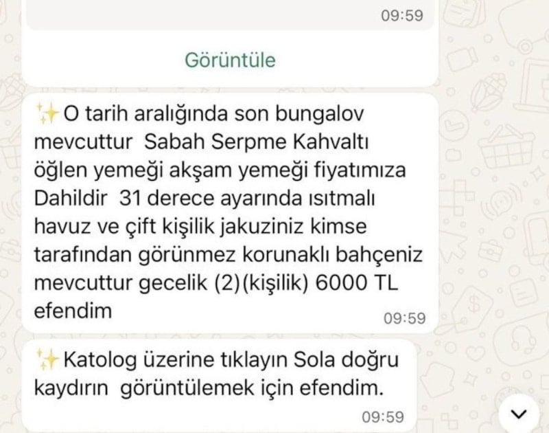 Hesap yöneticisi tarafından WhatsApp'a yönlendirilen mağdura, tesise ait olduğu belirtilen profesyonel görseller ve konaklama detayları gönderildi.