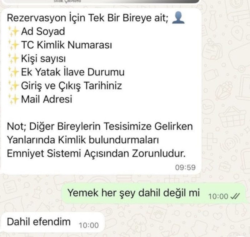 Rezervasyon yapmak istiyor. Uygulamaya girildiğinde WhatsApp üzerinden dönüş yapılıyor. Konaklama tarihleri, kişi sayısı gibi tüm detaylar soruluyor. Müvekkilim hepsine cevap veriyor. Ardından tesisle ilgili bilgiler ve görseller gönderiliyor.