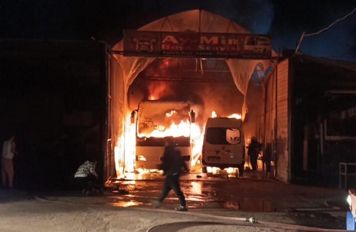 Yaklaşık 2 saatlik çalışma sonucu yangın söndürülürken, iş yeri ve alevlerin sıçradığı otobüs, minibüs ve bir otomobil küle döndü.