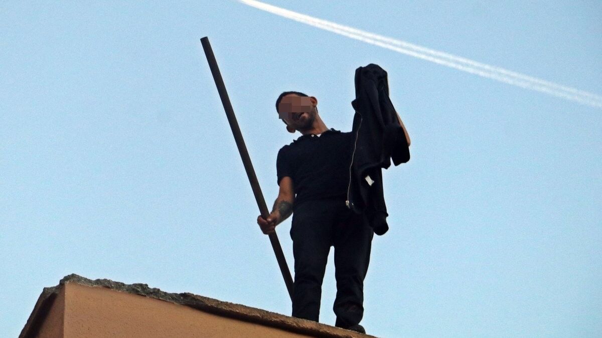 İHA'nın haberine göre çatıda eline geçirdiği tuğlaları parçalayıp etrafa atmaya başlayan şahıs, uyarılara bir türlü kulak asmadı.