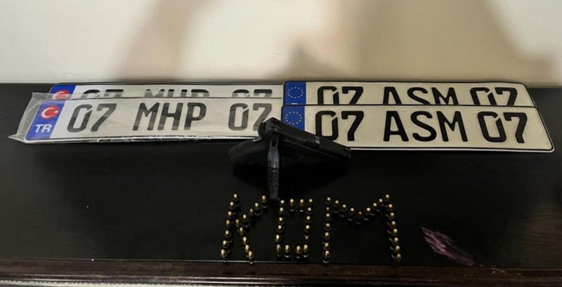 Şüphelinin yakalandığı yerdeki aramada 9 milimetre çaplı 1 ruhsatsız tabanca, bu tabancaya ait 1 şarjör ve 9 milimetre çaplı 56 mermi ve 2 çift sahte plaka ele geçirildi.