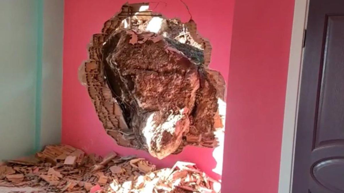 Antalya'nın Alanya ilçesinde yaşayan Çetinkaya ailesi, yataklarından odalarının üzerine düşen dev kaya ile uyandı.
