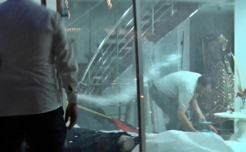 Ekiplerin tüm çabalarına rağmen gelinlikleri parçalamaya devam edip içerideki eşyalara da zarar veren Bahadır T., bir süre sonra ise üst kattan aldığı mutfak tüpünü getirdi.