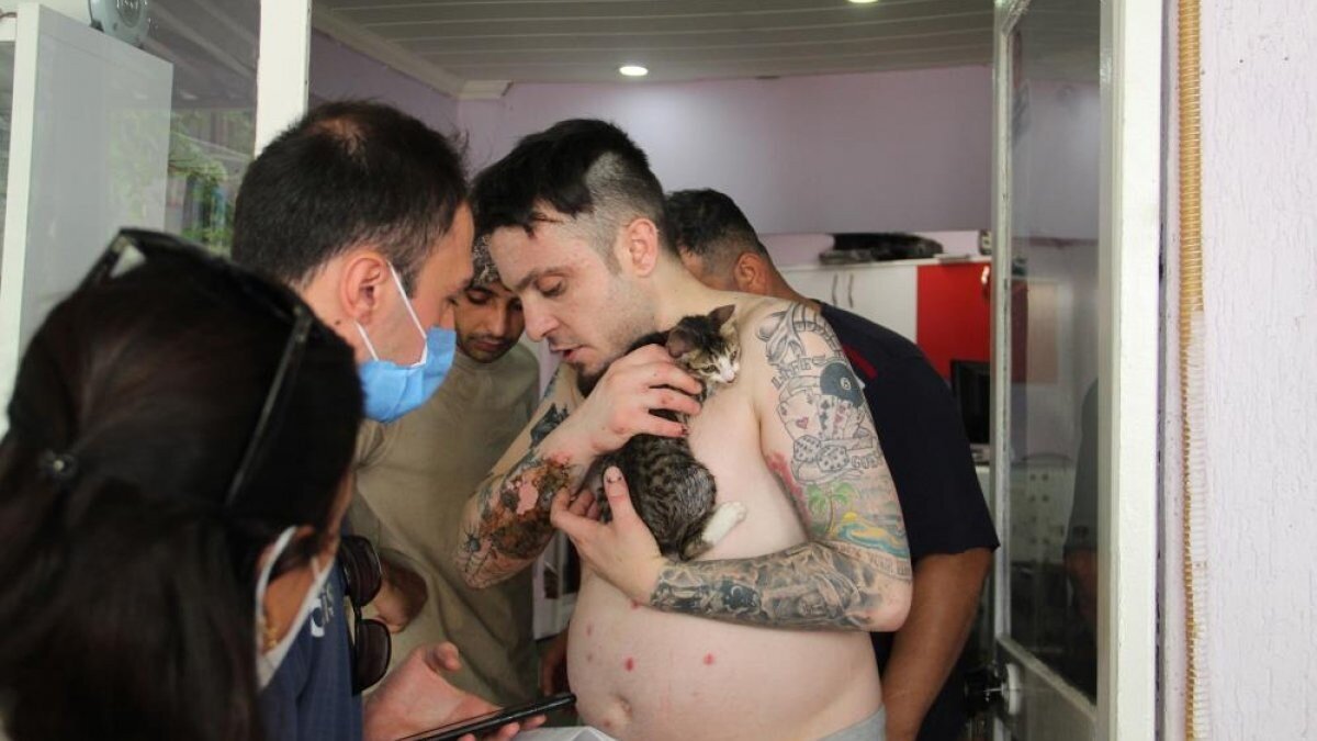 Bir hayli bitkin ve üzgün olduğu görülen Çiçek’in yanına itfaiye eri tarafından bir süre sonra kedisi getirildi. Kedisini kucağına alıp seven, öpen Lütfi Çiçek, daha sonra yaralarının tedavisi için ambulansa alındı.