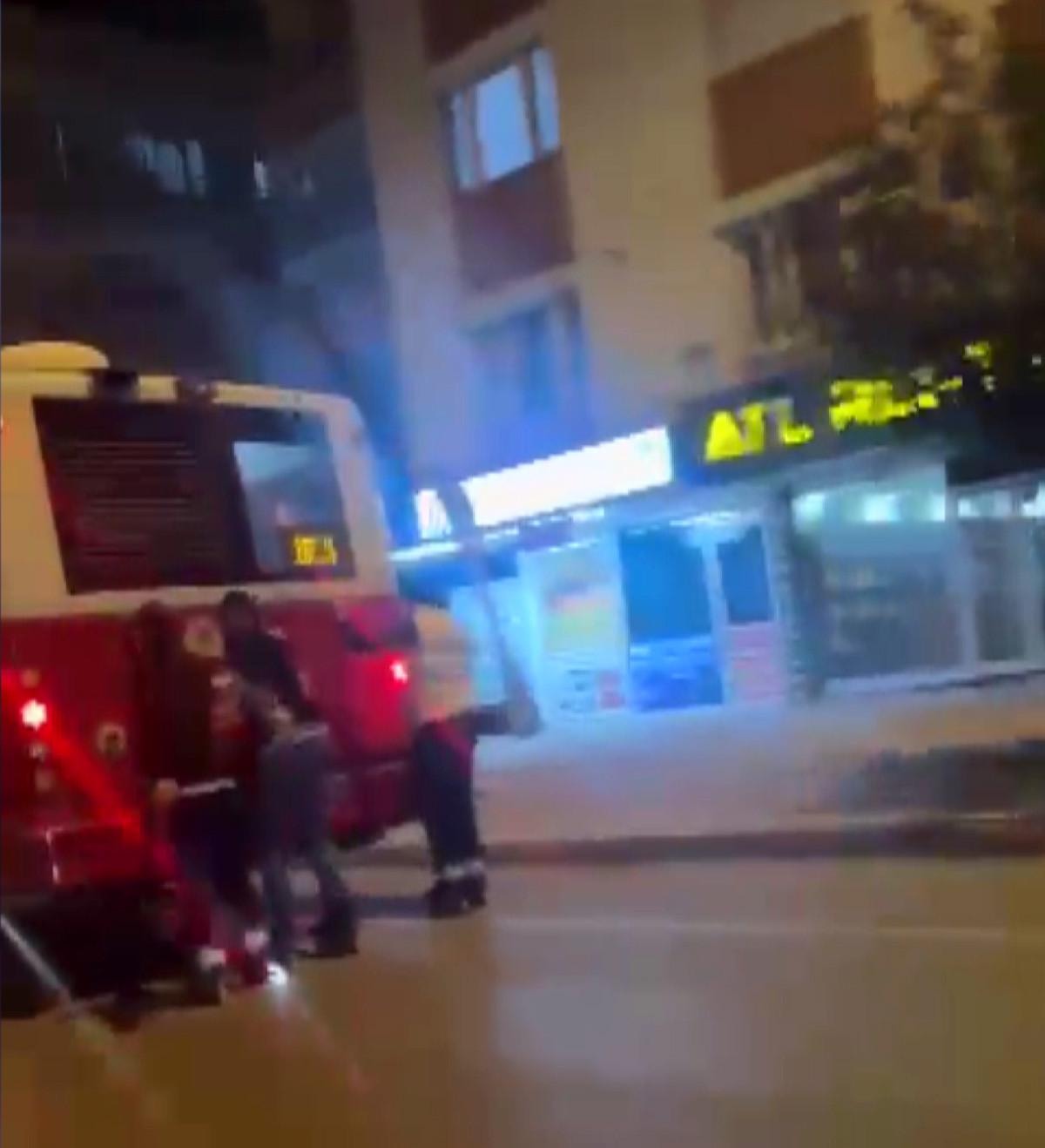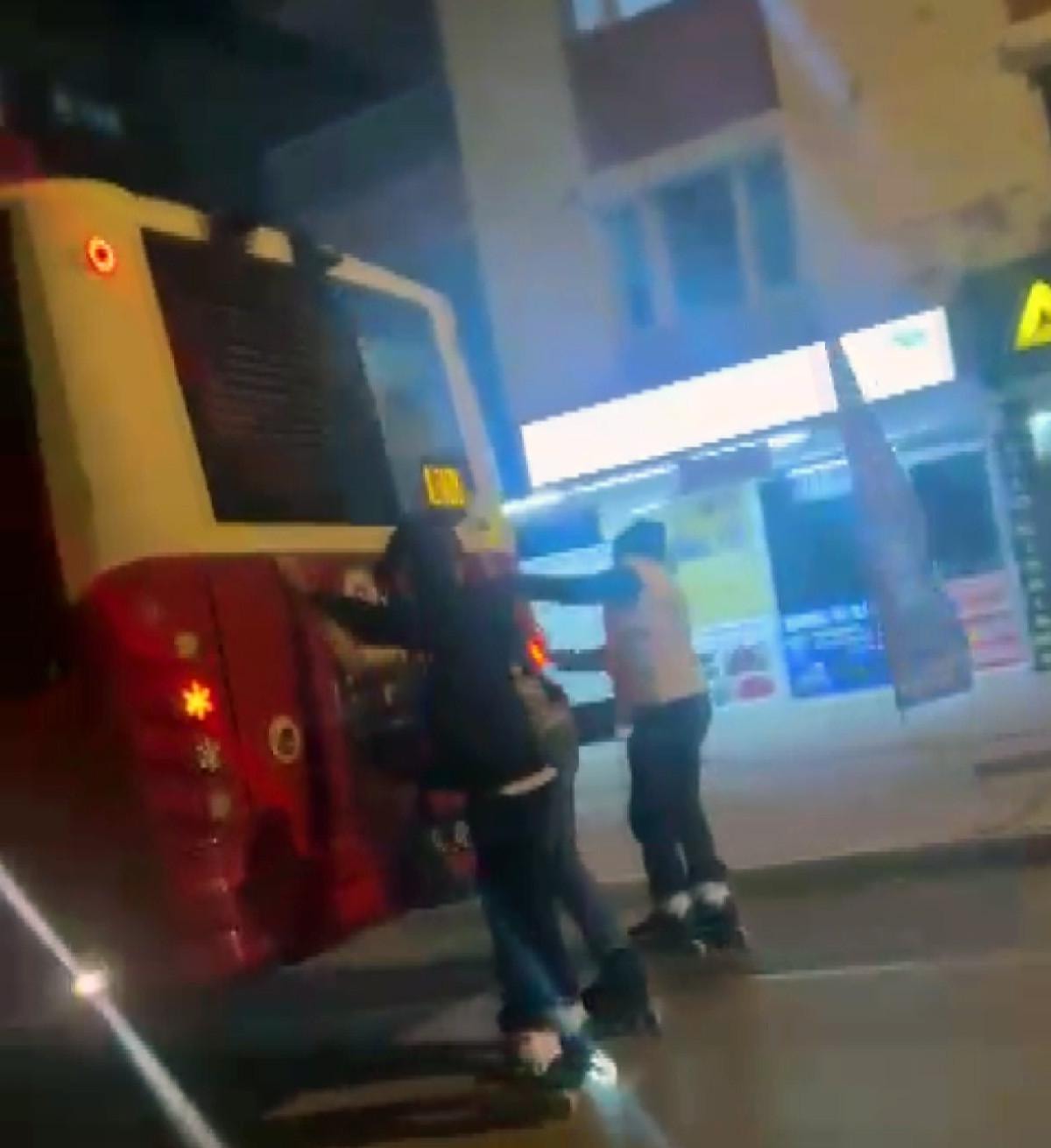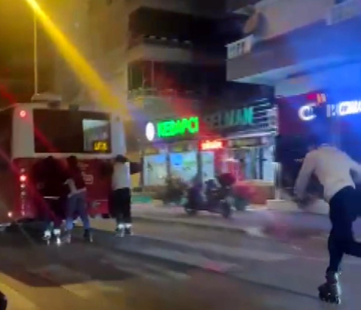 Muratpaşa ilçesi Çağlayan Mahallesi'nde gece saatlerinde patenli 3 genç, belediye otobüsünün arkasına tutunarak yolculuk yaptı.