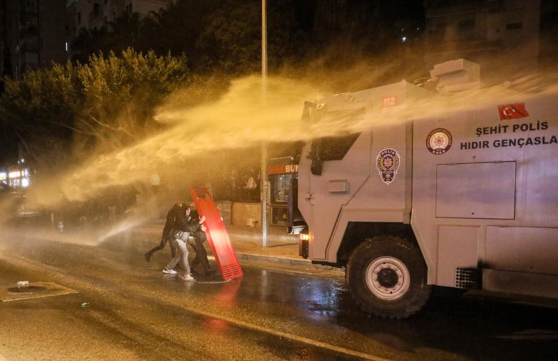 Güvenlik güçlerine saldırgan gruba karşılık üniversite kampüsü girişinde polis, TOMA araçlarından su sıkarak müdahale etti.