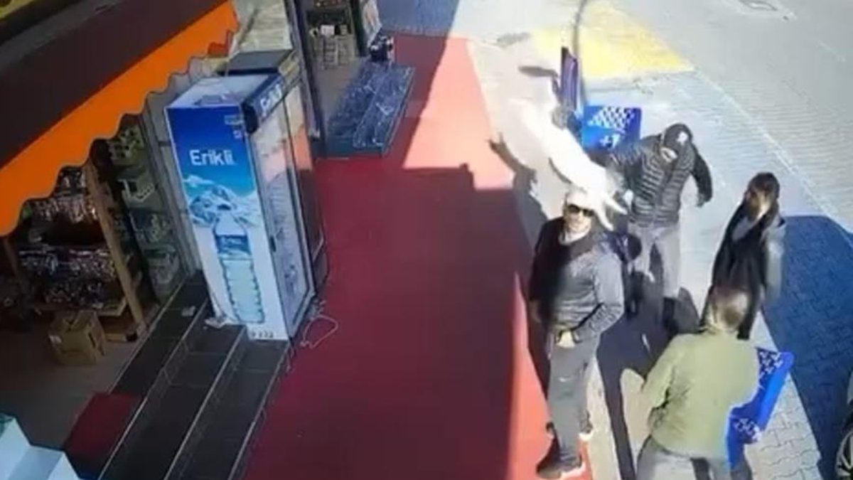 İlginç karşılaşma, arkadaş grubunda eğlenceli bir anıya dönüşürken, olay iş yerinin güvenlik kamerasına yansıdı.