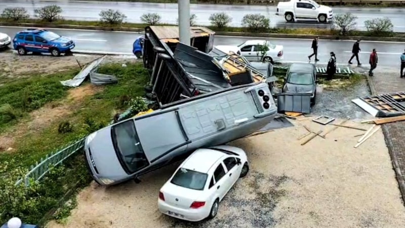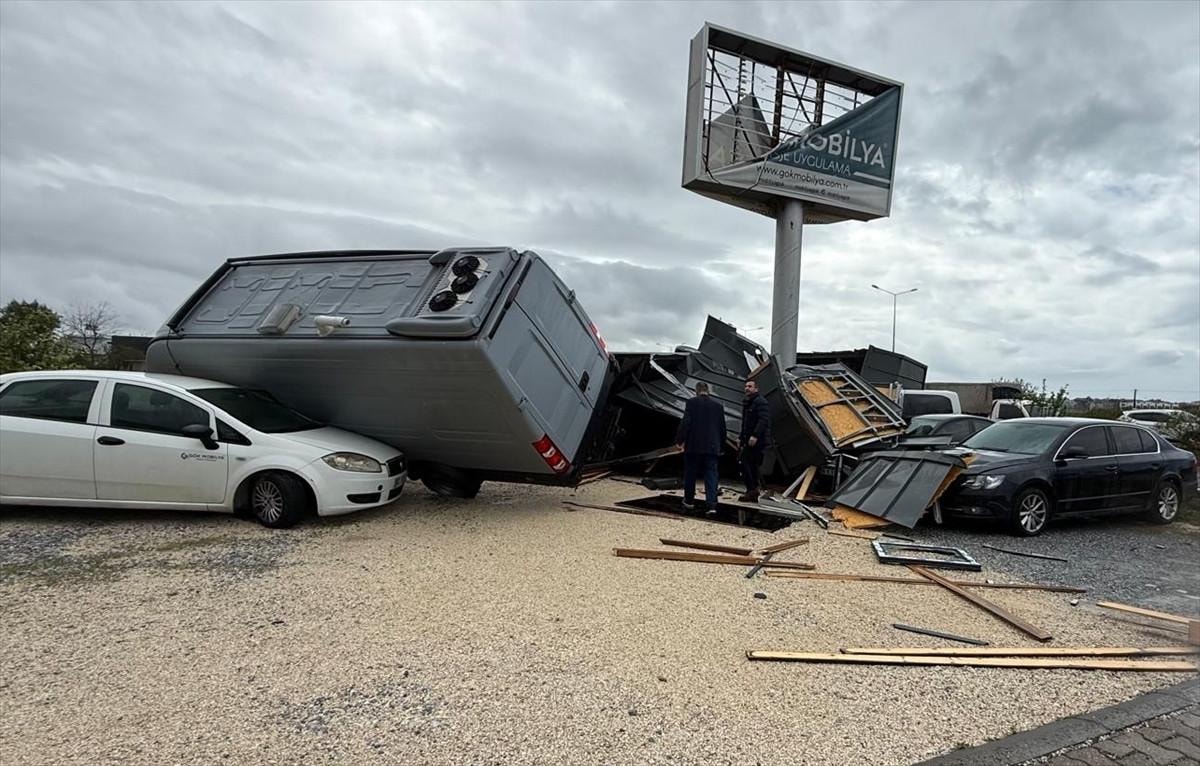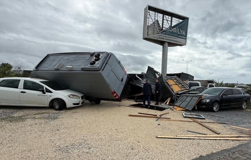 Bugün saat 11.30 sıralarında çıkan hortum, bir mobilya satış mağazası önünde bulunan 2 ton ağırlığındaki üçgen evi otomobillerin üzerinden uçurup, 30 metre ileride ters döndürdü.
