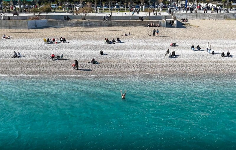 Hava sıcaklığının 19 dereceye ulaştığı kent merkezindeki Konyaaltı Sahili'nde denize girildi.