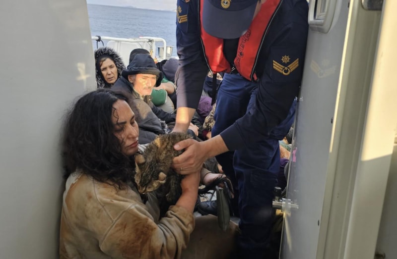 Kurtarılan göçmenlerden bir kadının, yanında kedisinin olduğu görüldü.