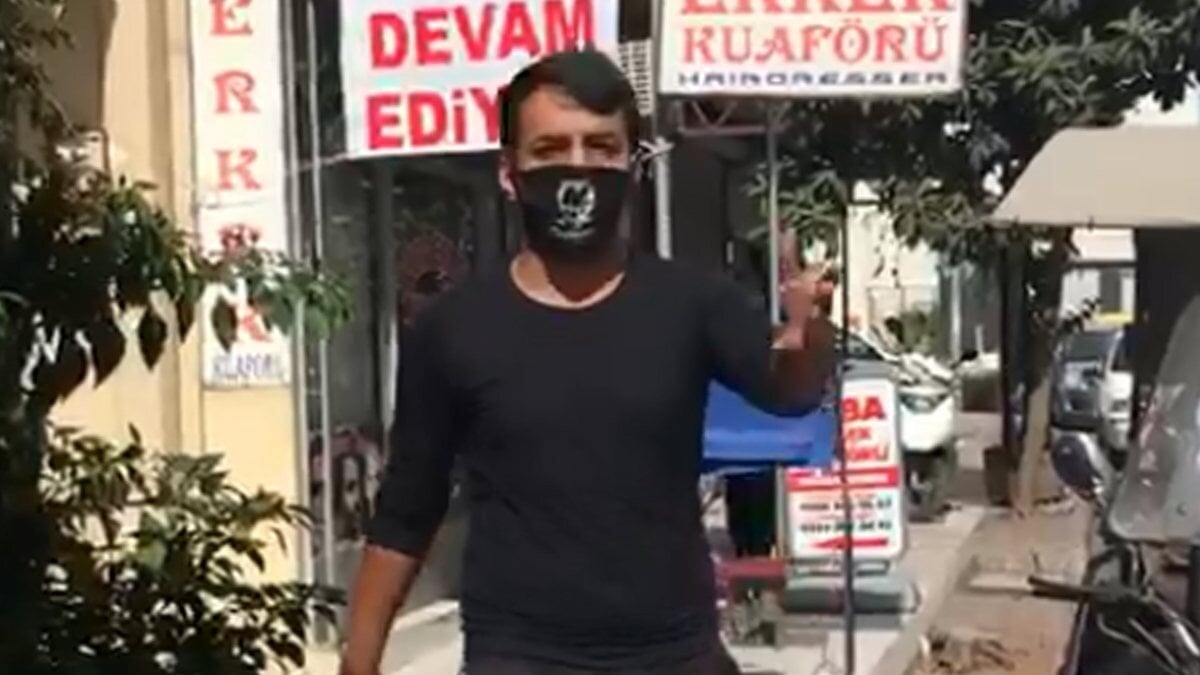 Büyükşehir Belediyesi Zabıta Dairesi Başkanlığı ekipleri, caddede denetim yaptıkları sırada kaldırımda maske satan, adının 'Emrah' olduğu belirtilen satıcıya tezgahını kaldırmasını söyledi.