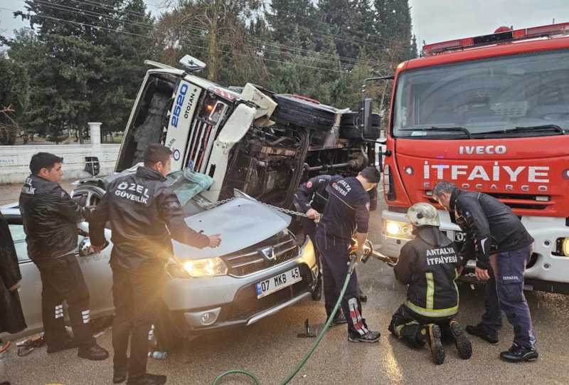 Kavşaktan caddeye savrulan kamyon, önünde ilerleyen Gülşen Saygılı yönetimindeki 07 MKB 45 plakalı otomobilin üzerine devrildi. Çevredekilerin ihbarı üzerine kaza yerine sağlık ve itfaiye sevk edildi.