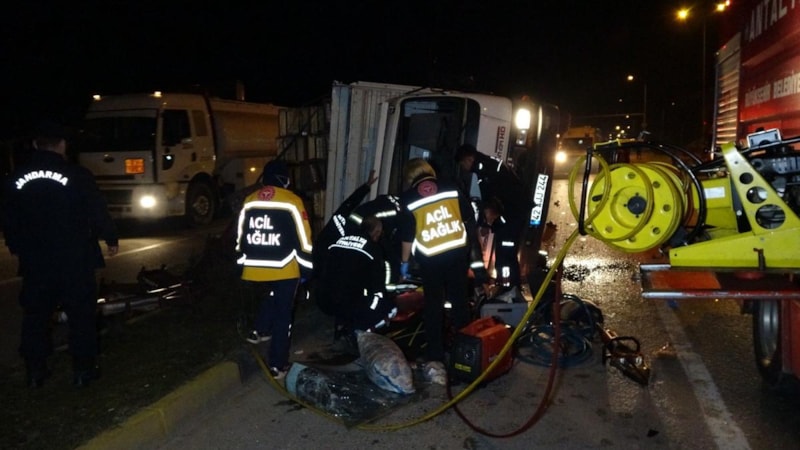 İtfaiye ekipleri, devrilen kamyonun şoför mahallinin altında kalan ve bordür taşı sayesinde hayata tutunan kamyon sürücüsünü de uzun ve dikkatli bir çalışmanın ardından bulunduğu yerden çıkardı.