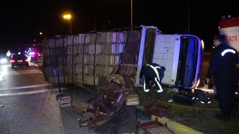 Aşırı hızlı olduğu bildirilen otomobilin çarptığı kamyon, çarpmanın şiddetiyle toplama yol ile anayol arasındaki refüje devrildi.