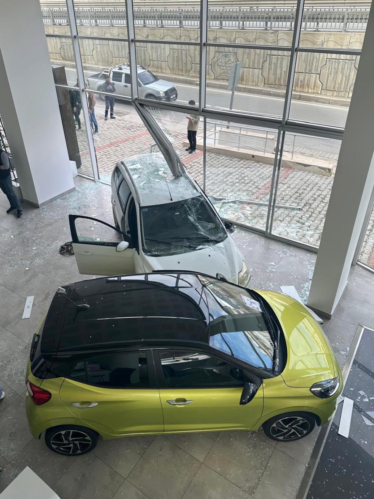 Bayinin vitrinini yıkıp içeri giren otomobil, park halindeki sıfır araca vurarak durdu.