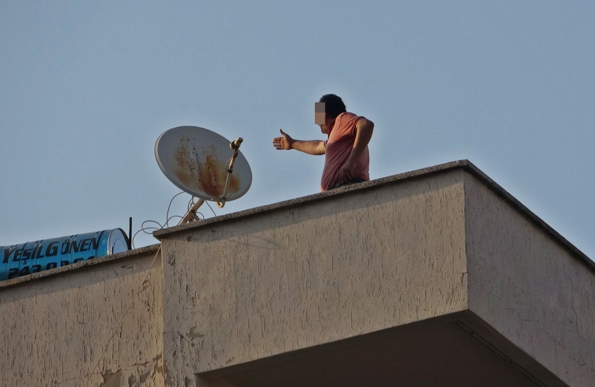 Bahadır T. zaman zaman çatıdaki korkuluklara çıkıp tehlikeli hareketlerde bulunurken, mahalleliler ise olan biteni meraklı gözlerle izledi.