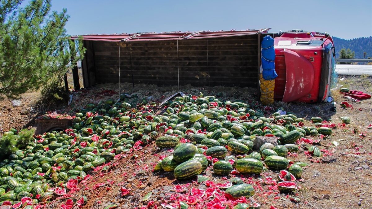 Kamyondaki tonlarca karpuz ise yol kenarına dökülerek zarar gördü.