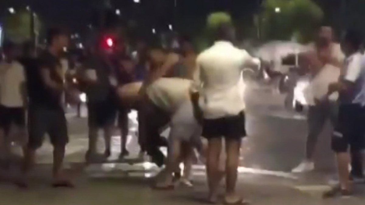 Aracın çarptığı kişi yerde acı içinde kıvranırken, arkadaşları ona rağmen kavgayı sürdürdü.