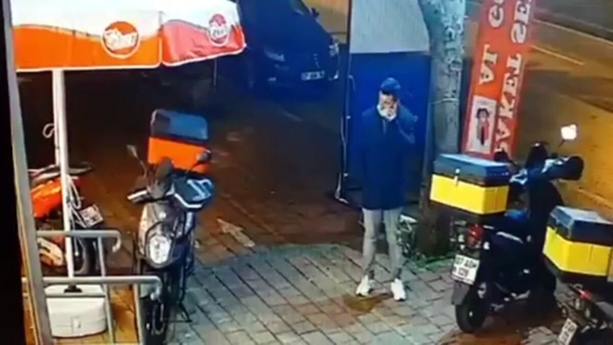 Dün gece kebapçıdaki çalışanların içeride olduğu sırada motosikletlerin yanına gelen bir şüpheli, bir süre motosikletleri inceleyip çevreyi kontrol etti.
