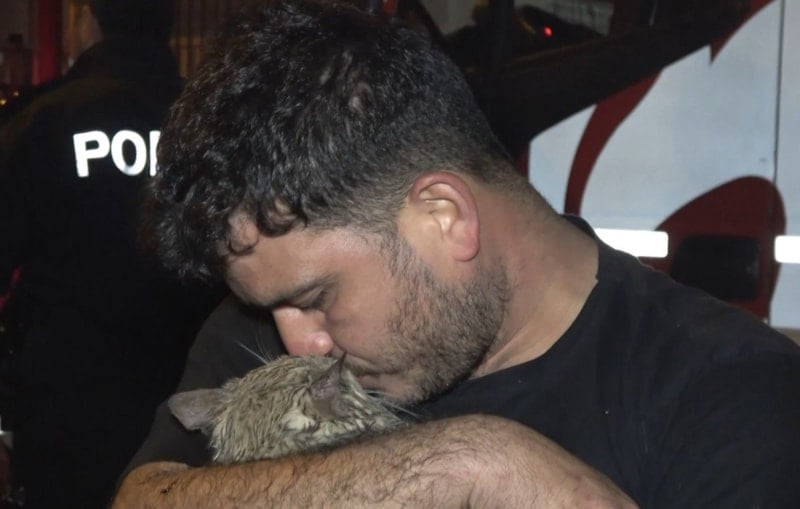Dumandan etkilenmemesi için ekipler tarafından güvenli alana alınan kediye mahalleli sahip çıktı.