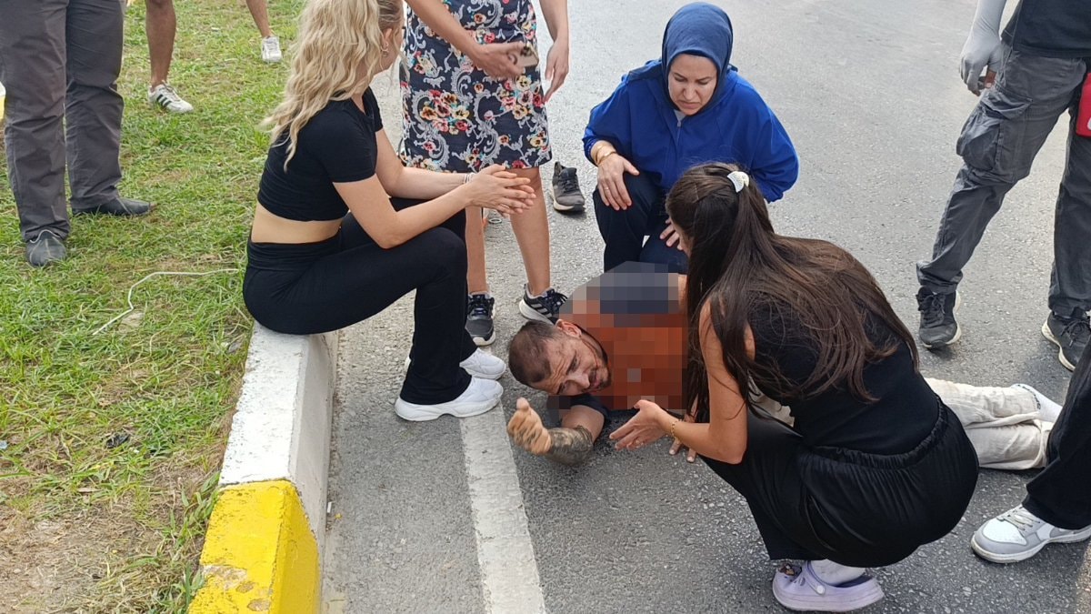 Kazayı yara almadan atlatan Özgür Bayar, yerde yatan arkadaşının başından ayrılmadı.