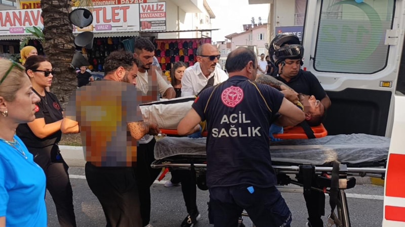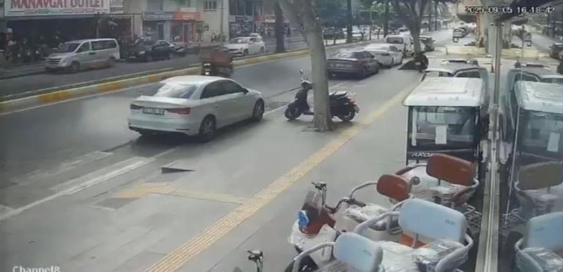 Manavgat ilçesinde iki motosiklet çarpıştı ve bir sürücü ağır yaralandı. Kazanın etkisiyle savrulan sürücü refüjdeki ağaca çarptı. Olay anı güvenlik kamerasına saniye saniye yansıdı.