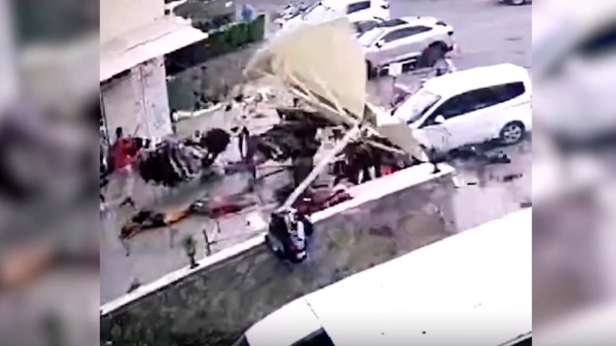 Devrilen şemsiye, park halindeki araca çarptı, giysiler etrafa saçıldı. Yaşananlar güvenlik kamerasınca kaydedildi.