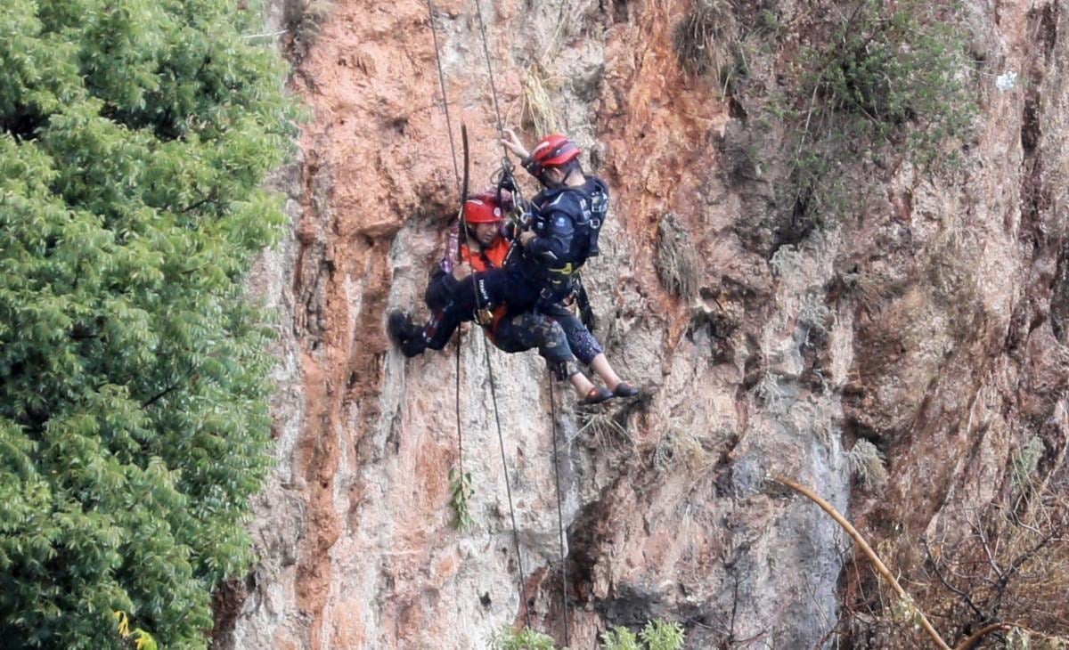 Olay yerine gelen itfaiye ekibi, ağaca bağladığı halat yardımıyla yaklaşık 20 metrede mahsur kalan Nubar B.'nin yanına indi.