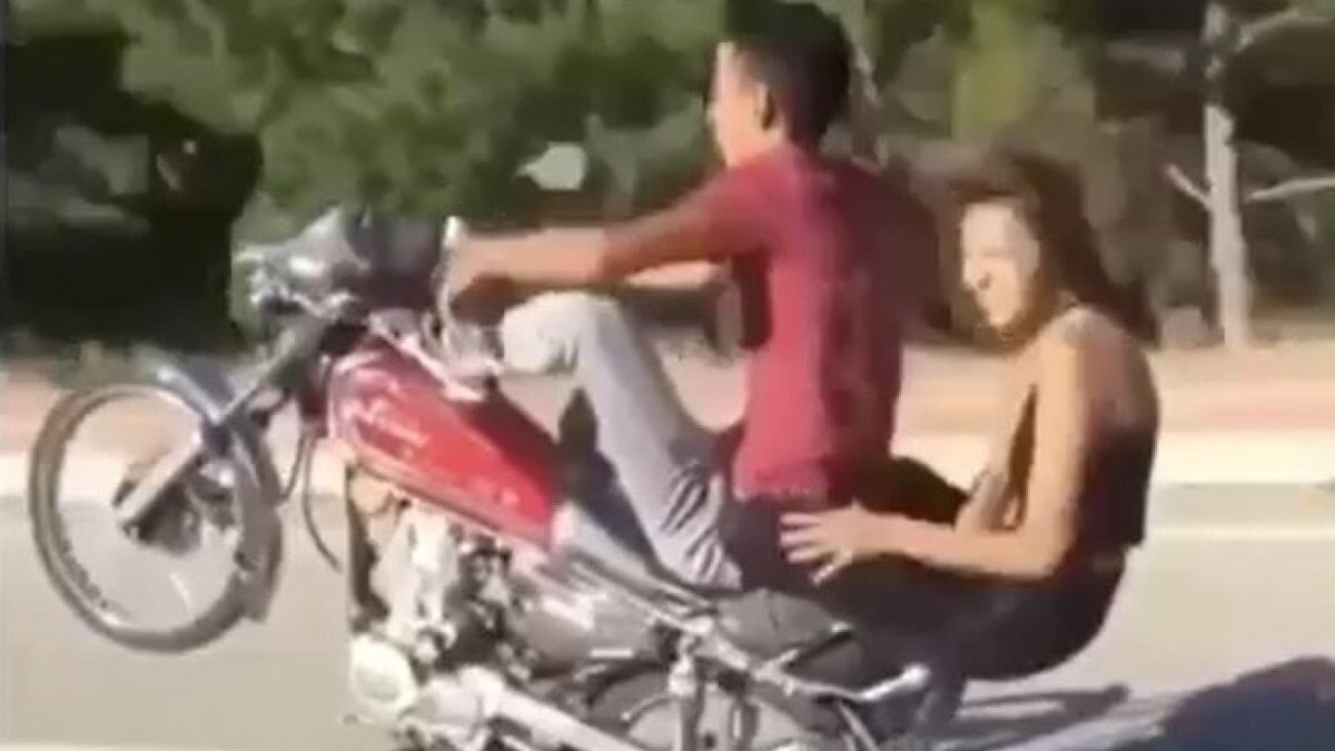 Antalya'da, seyir halinde olan bir motosiklet sürücüsü tek teker üzerinde ayaklarını kaldırıp ilerlerken, arkasında oturan genç kız ise geriye doğru giderek demirden destek aldı.