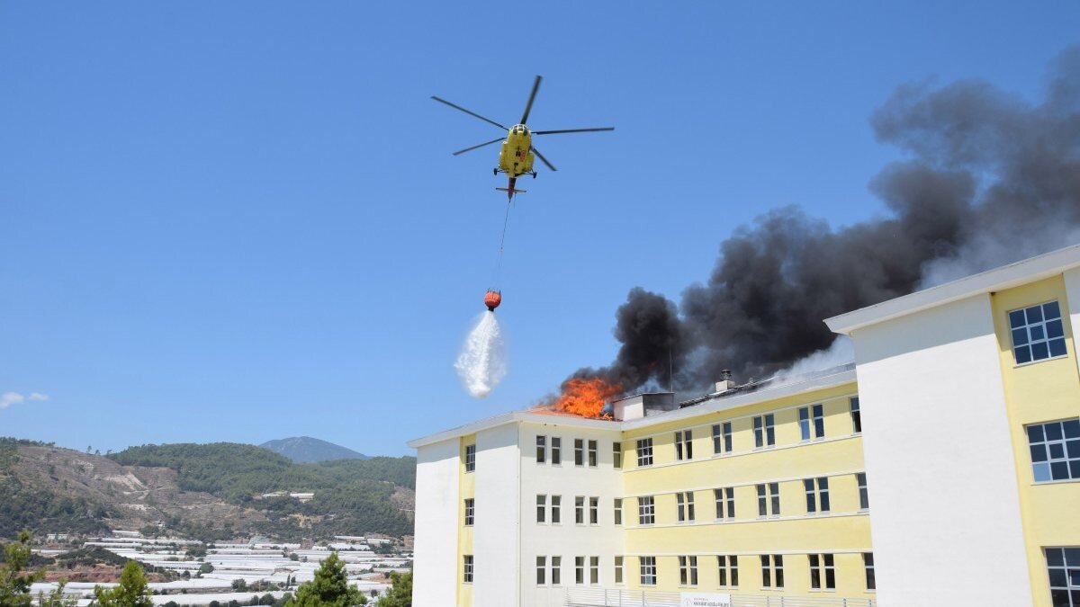 Antalya’nın Kumluca ilçesinde, Havva- Sedat Avcıoğlu Fen Lisesi yanında bulunan 4 katlı öğrenci yurdu binasının çatısında, öğle saatlerinde yapılan tadilat sırasında yangın çıktı.