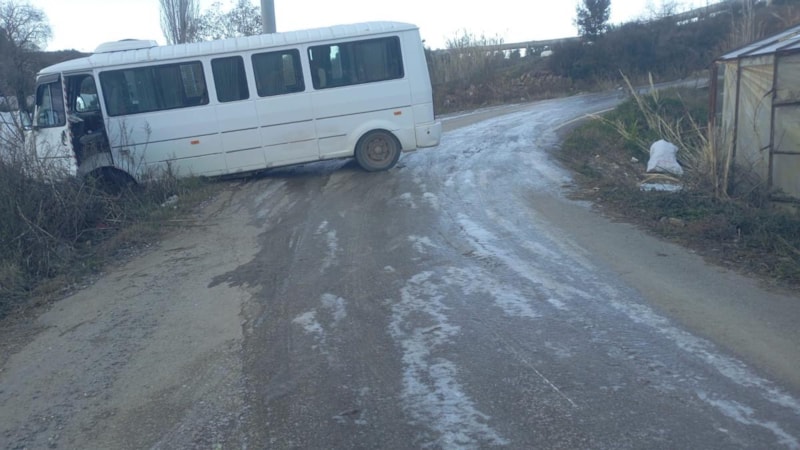 Antalya'nın Gazipaşa ilçesinde Erhan Taşdemir'in kullandığı okul servisi, yolda oluşan buzlanma nedeniyle kontrolden çıkıp, yan şekilde kayarak devrilme tehlikesi atlattı.